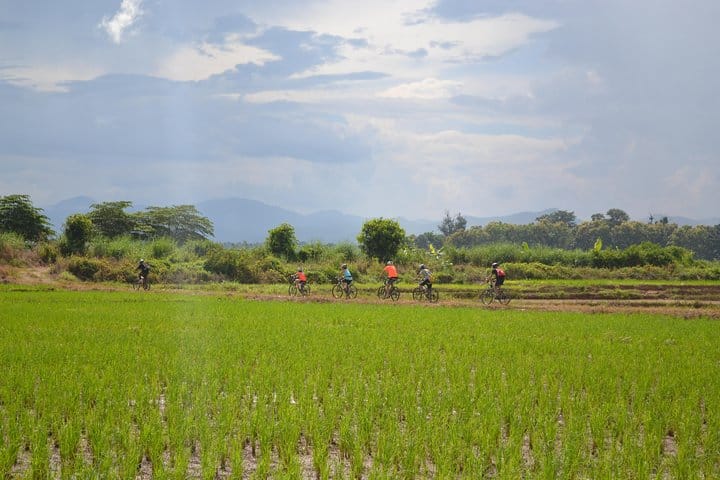 Participants will enjoy a memorable day of cycling through a lush, fertile valley nourished by the waters of Mae Ngat Dam. Ride leisurely past vibrant rice paddies, plantations, and charming villages, with plenty of stops to explore points of interest along the way. Discover the art of rice farming and gain cultural insights at the stunning Wat Ban Den temple. This active adventure includes a delicious Thai lunch served amidst a tropical garden. Conclude the day with a refreshing visit to the Buatong Waterfall (Sticky Waterfall), before returning to Chiang Mai.